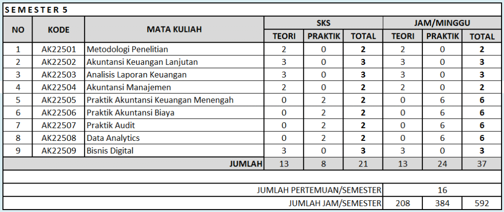 Kurikulum semester 5 merujuk pada rencana pembelajaran yang disusun untuk periode setengah tahun ke lima dalam suatu jenjang pendidikan. Kurikulum ini mencakup berbagai mata pelajaran atau tema yang akan dipelajari, serta metode pembelajaran yang akan digunakan untuk mencapai tujuan pembelajaran. Total SKS semester 5 adalah 21 SKS dengan sebaran mata kuliah sebagai berikut: